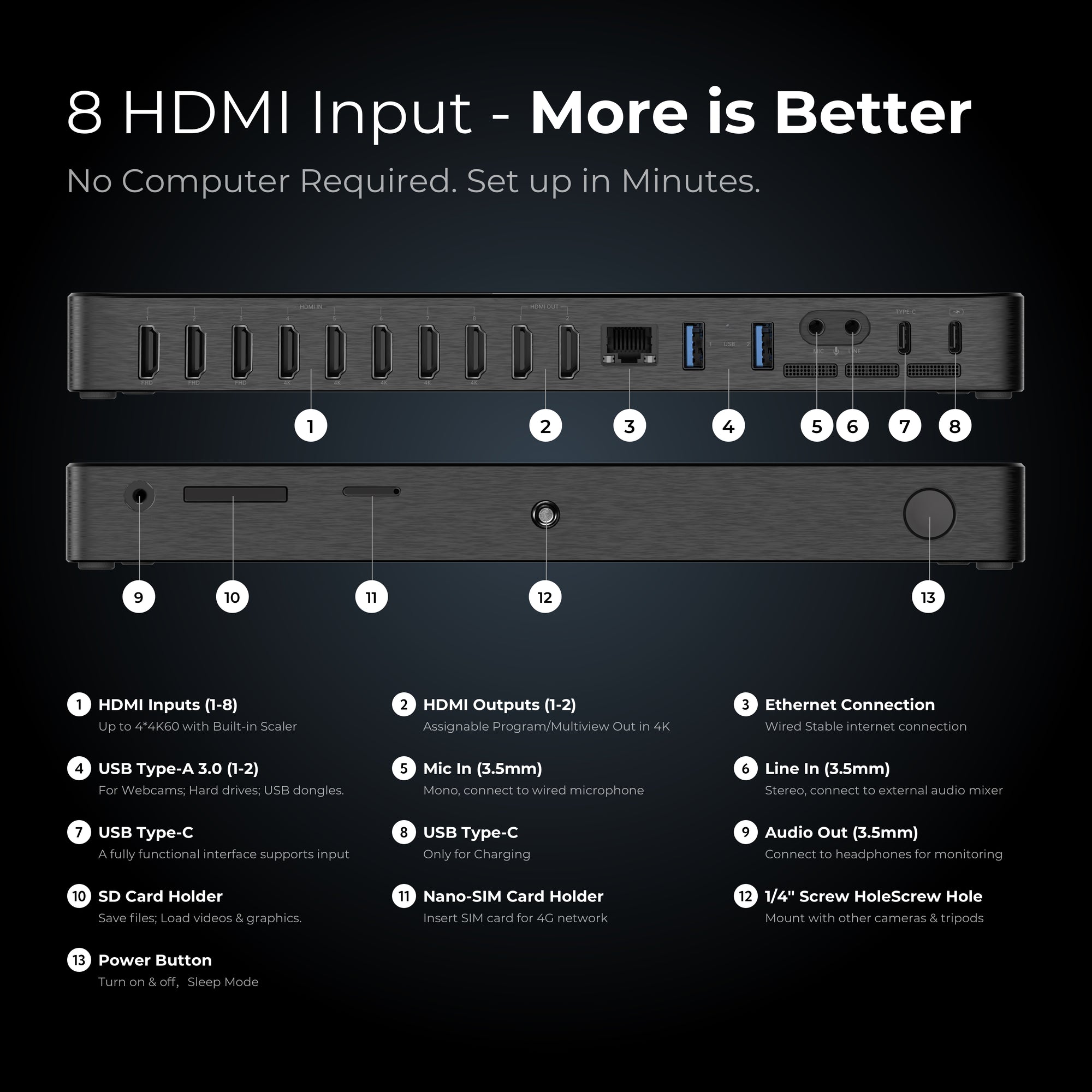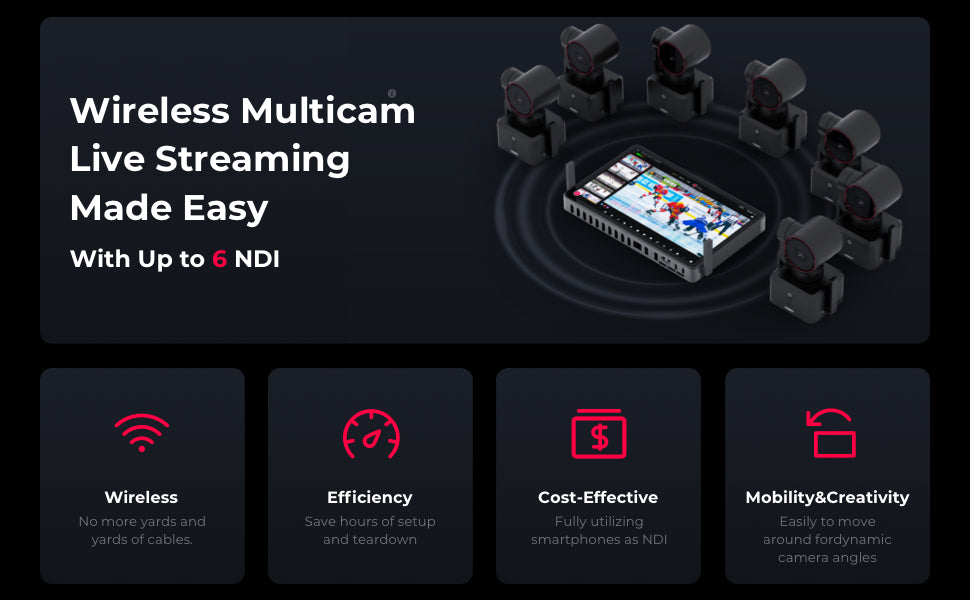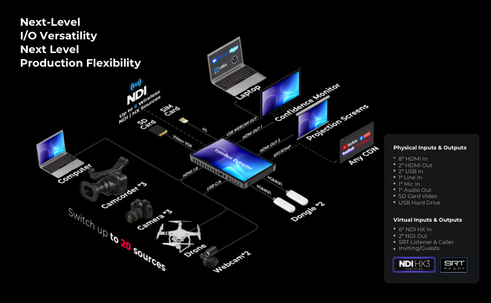 From its 8 HDMI inputs, 2 assignable HDMI output to its 11.2-inch OLED touchscreen(800-1,000 nits of brightness), 4K streaming, 4K ISO recording, Qualcomm 8 Gen2 processor, up to 10-hour battery power, up to 8 NDI-HX inputs, YoloBox Extreme delivers unmatched power, flexibility, and ease of use for any production scenario.