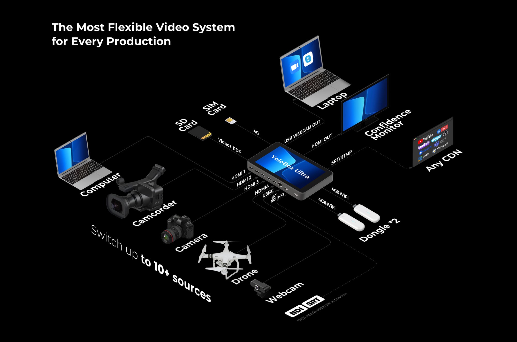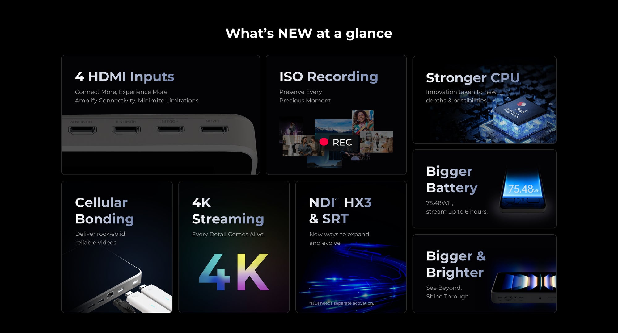 • 4K Live Broadcasting: A 4K HD device that functions as a switcher, monitor, encoder, and recorder, supporting 4G LTE, WiFi, Ethernet, and dual 4G Dongles. Ideal for events like sports, weddings, and church