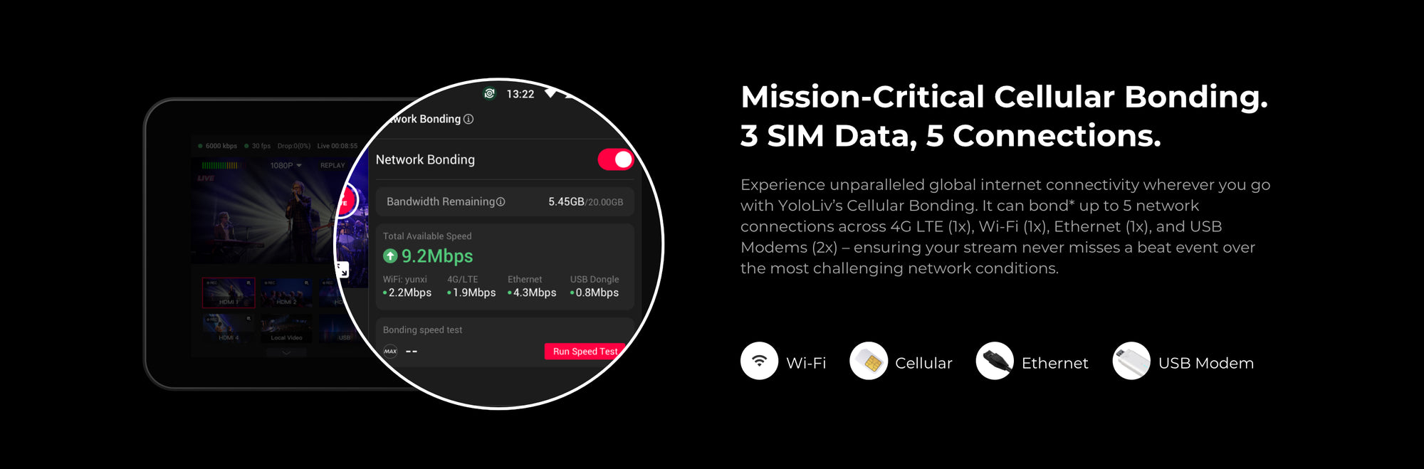 • Cellular Bonding: Combine up to 5 network connections(2x USB Modems, 1x 4G LTE, 1x Wi-Fi, 1x Ethernet) to ensure uninterrupted streaming, even in challenging conditions. (Additional charges apply)