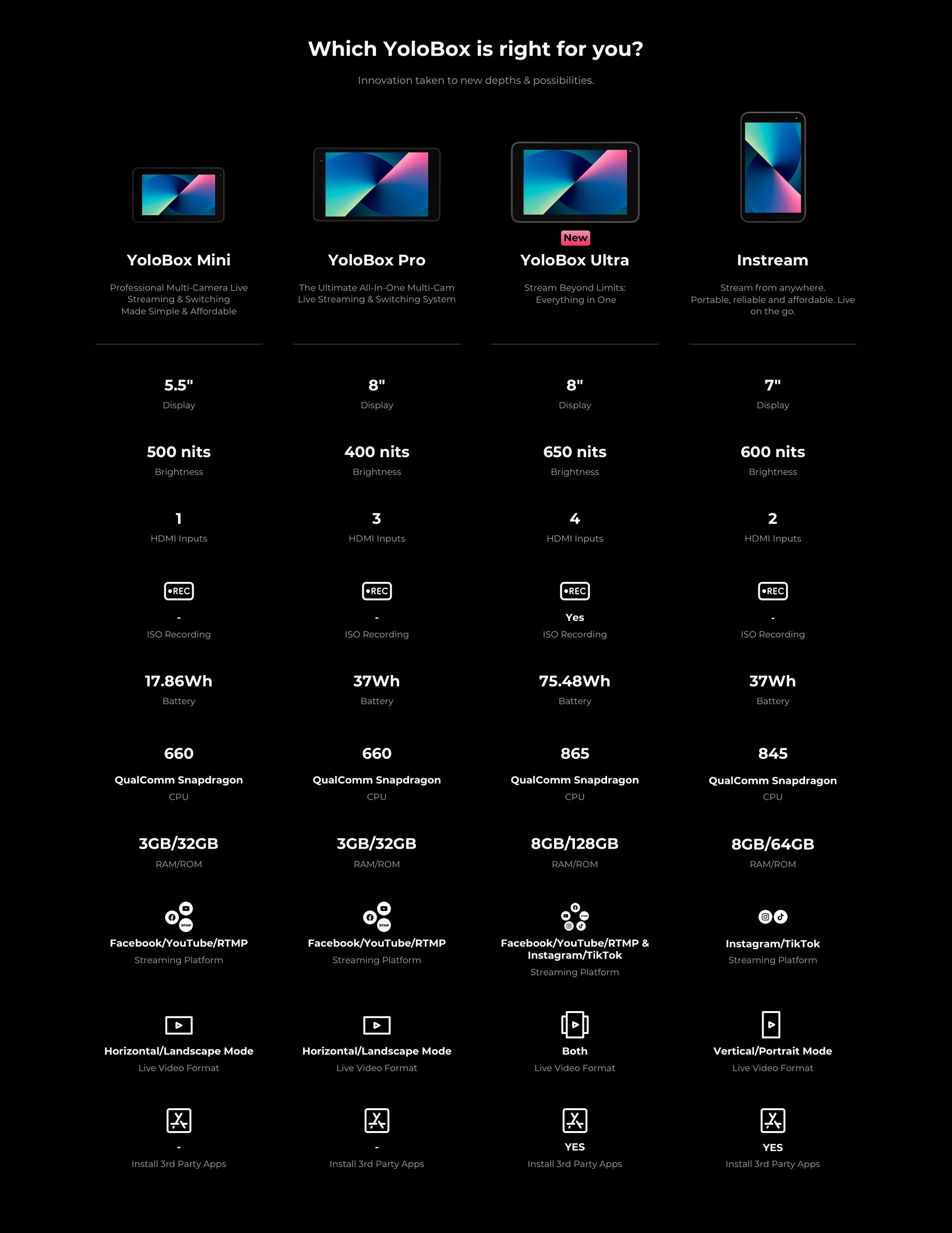 • Streaming Flexibility: YoloBox Ultra offers two modes—Live Streaming Mode for up to three horizontal destinations and Vertical Streaming Mode for two vertical destinations. However, simultaneous streaming in both modes is not supported