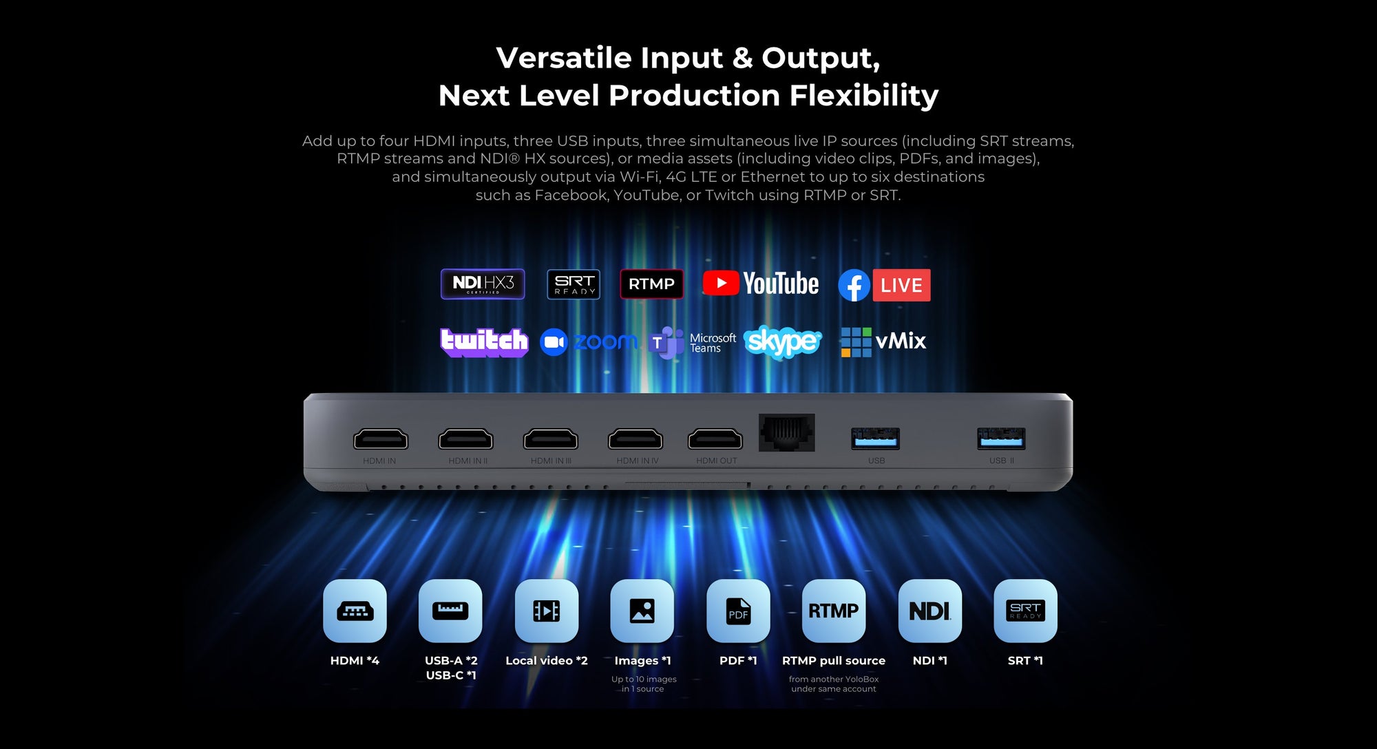 • NDI and SRT Integration: Enhance your stream with improved quality, reduced latency, and remote production capabilities via NDI and SRT. (Additional charges apply)