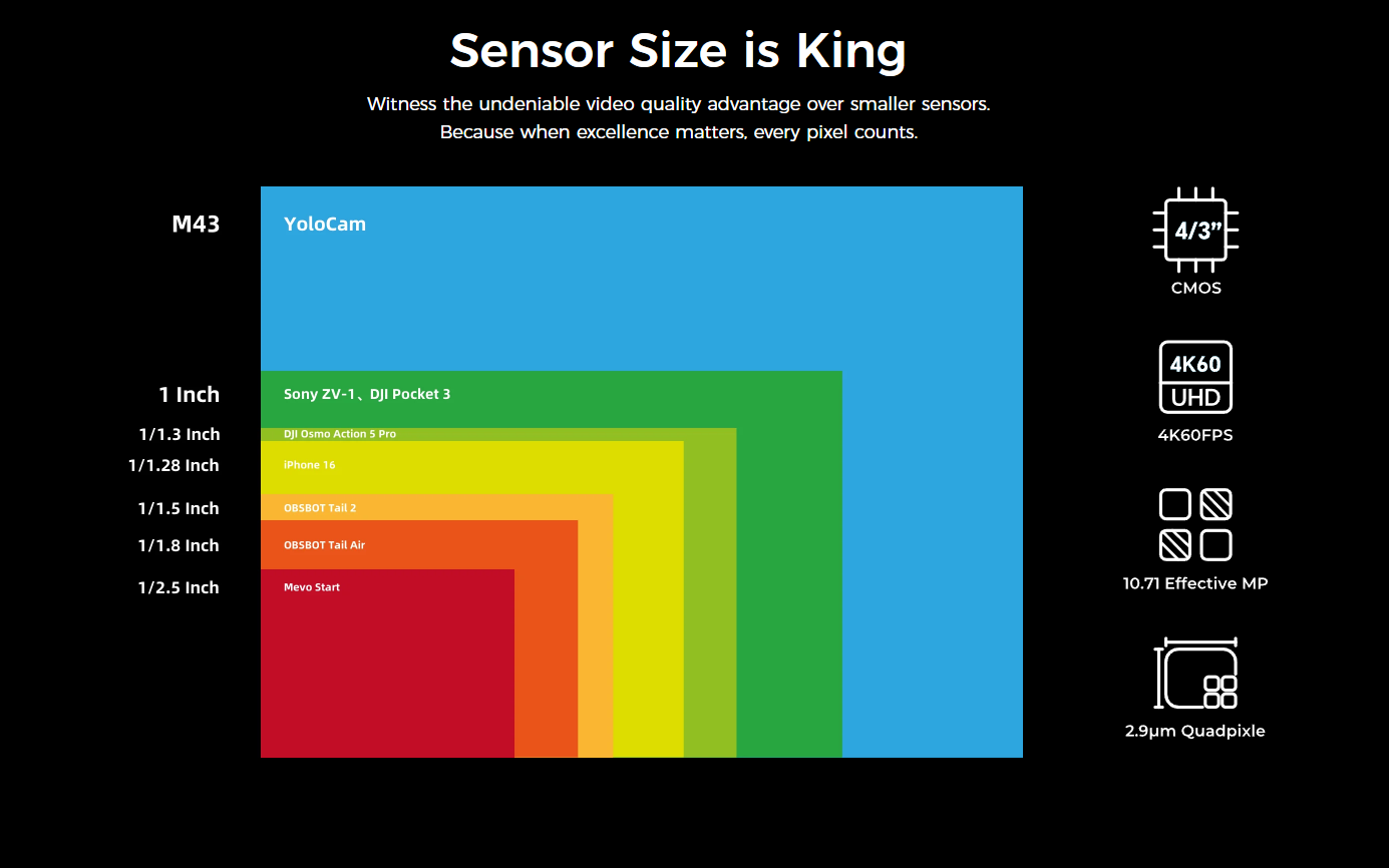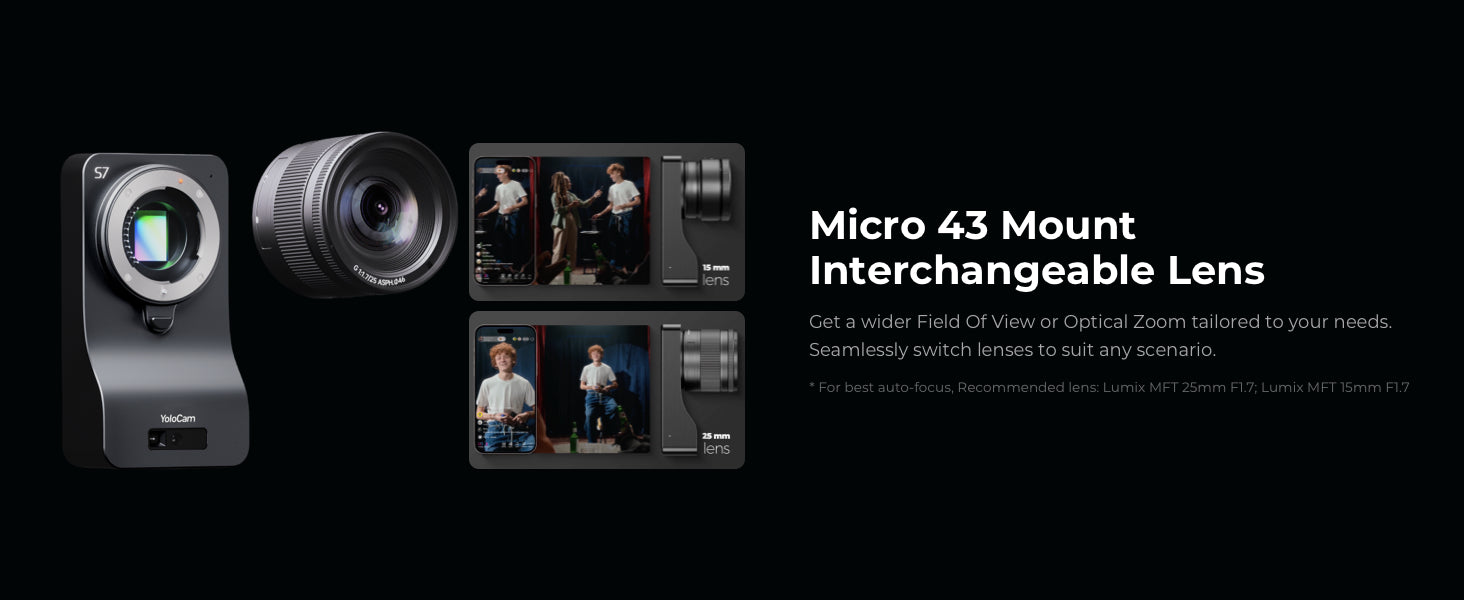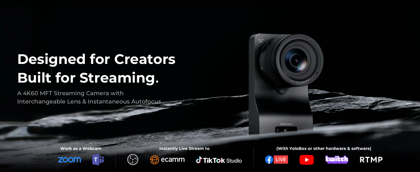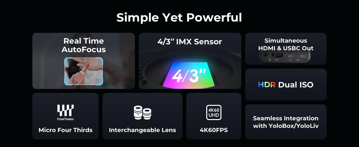 The YoloCam S7 delivers 4K60fps video quality with ultra-fast auto focus to keep your content sharp and engaging. Equipped with a 4/3” sensor and interchangeable lenses, it adapts to any scenario. With AI-driven adjustments, it simplifies your streaming workflow.